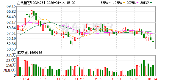 1月13日收盘,闻泰科技报收38.58元,跌3.45%;立讯精密报收54.58元,跌1.53%。