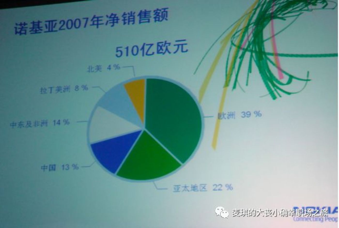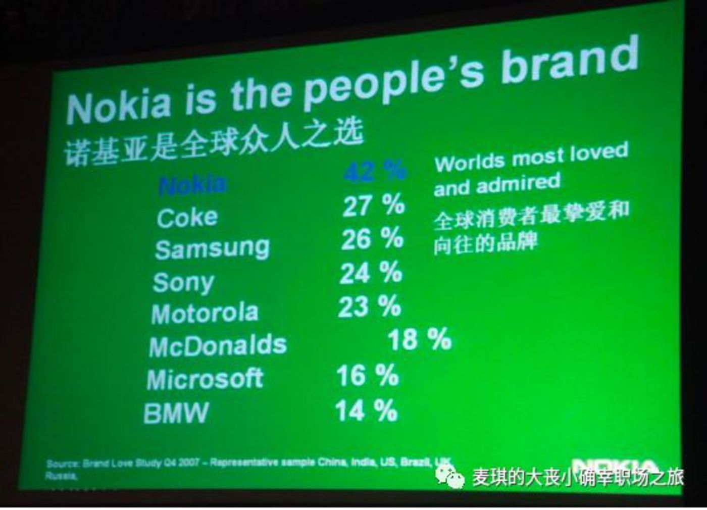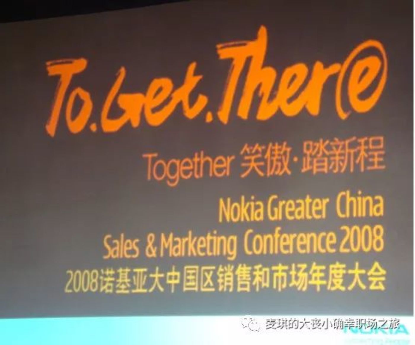 2008年2月26日,诺基亚大中国区销售市场年会在澳门的威尼斯人酒店召开,会议名称是“Together 笑傲踏新程”,庆祝2007年度销量超过七千万台,会中的keynote speech振奋人心,全球品牌喜好度42%超过可乐,索尼,麦当劳,微软,甚至宣布诺记已经是“互联网”发展公司。2007年,诺基亚手机全球营收510亿欧元,其中,中国单一国家贡献13%(66亿欧元,按当年汇率相当于660亿人民币!)