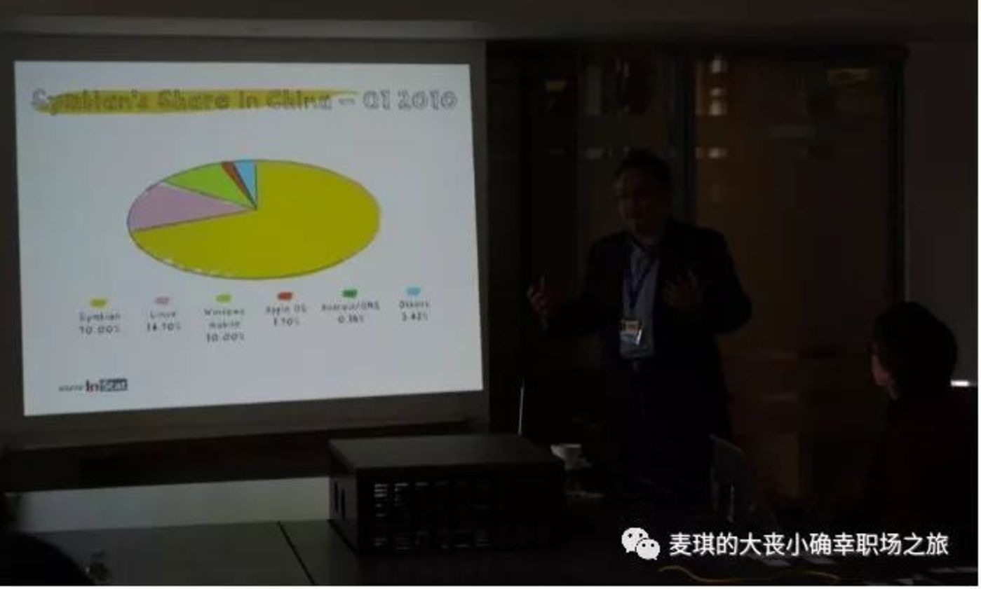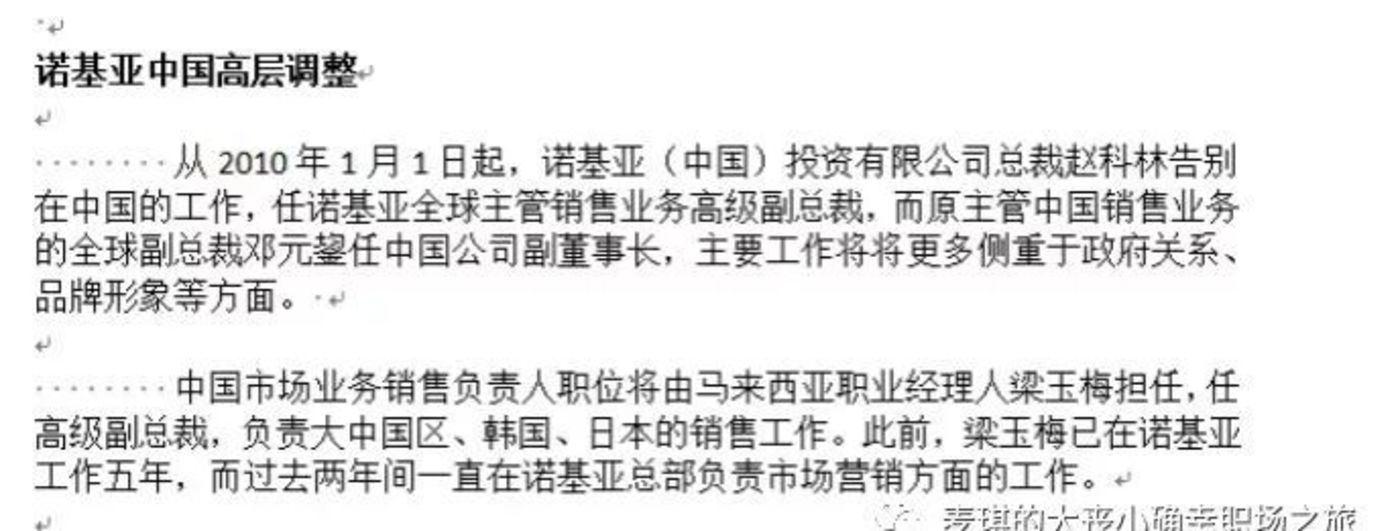 2009年全球的业绩受到重创,销售收入还能维持,但是行业利润占比已经腰斩,从2008年的64%跌至32%(被苹果大肆抢夺),市值下跌到仅为苹果四分之一。据此,就能理解从全球总部直至大中国区,诺记频繁的重组和任命邮件,绝对乱了阵脚和慌了人心!2010年1月,大中国区收到一封颇为shock的邮件,David 升任副董事长,相当于不再参与具体业务,Colin告别我们去了芬兰塔尖,而梁女士貌似代表芬兰来拯救大中国区业务。