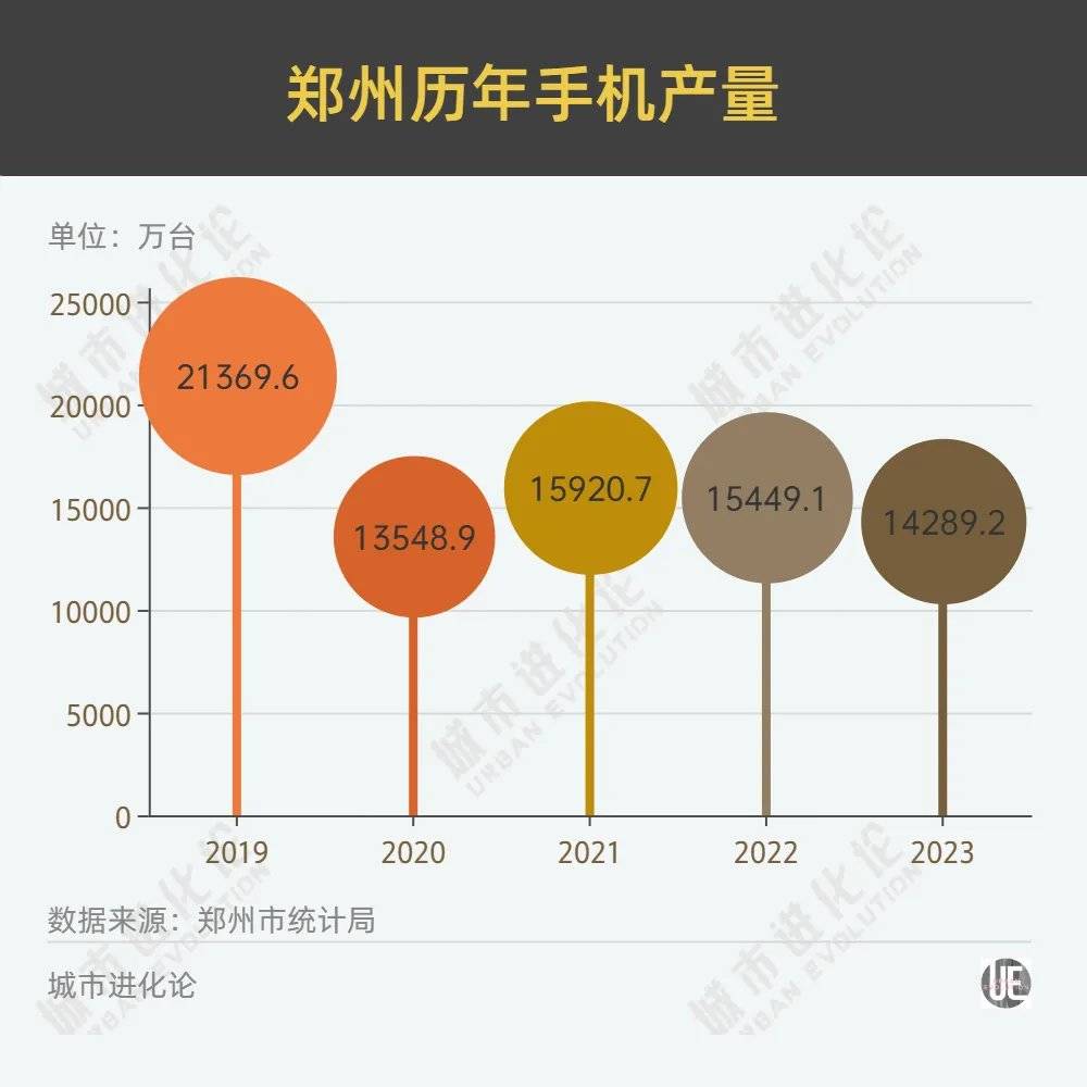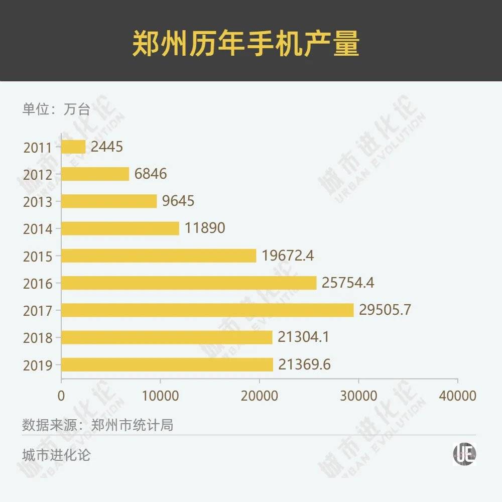 2011年,也就是富士康落地郑州的第二年,郑州统计局首次在年度统计公报中,将手机产量作为一项单独数据披露,当年郑州生产了2445万台手机。