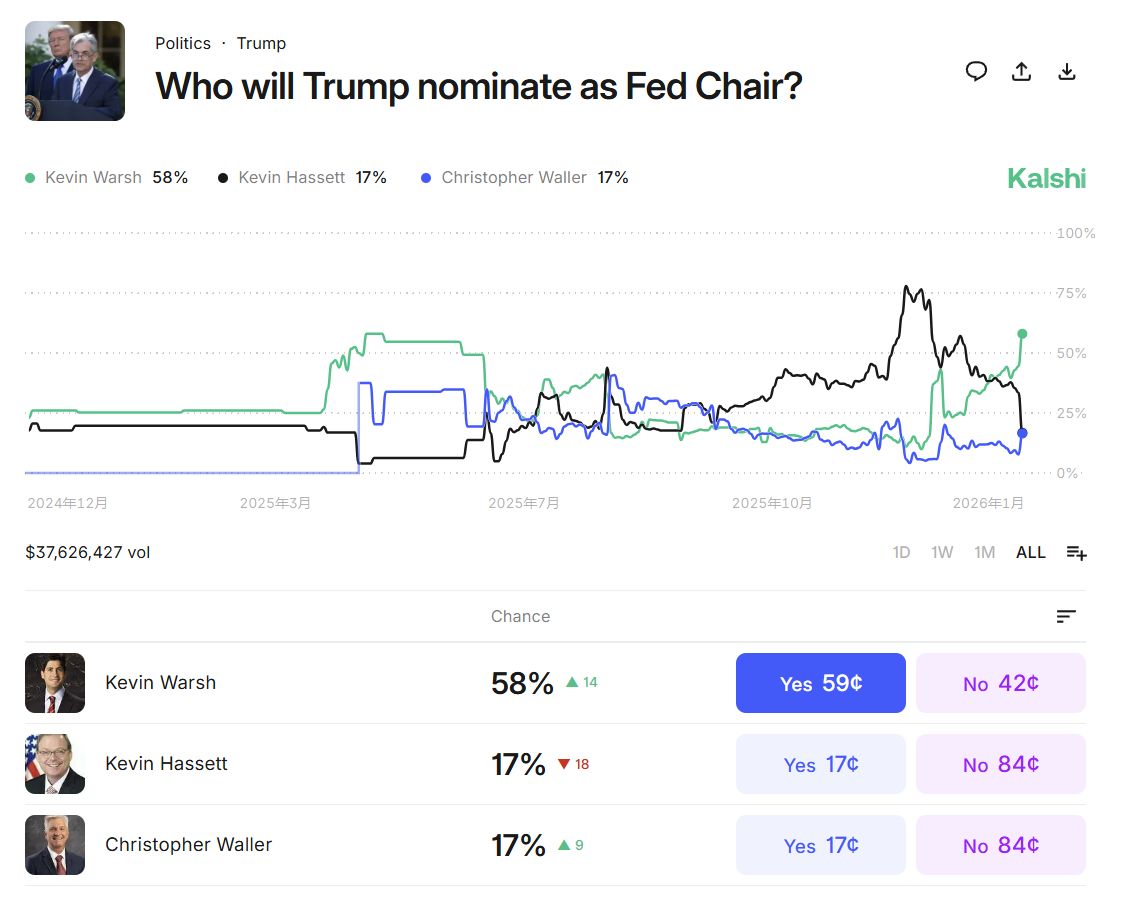 在预测平台Kalshi上,交易员大幅提高了沃什胜出的押注,使其明显领先此前被视为最主要竞争对手的哈塞特。数据显示,截至17日09点35分,沃什获得美联储主席职位的概率已升高至58%,而哈塞特的概率则降至17%。而在本周三,沃什与哈塞特在预测市场中的胜算还几乎不相上下。Polymarket上的数据也同样显示,沃什以56%的概率领先,哈塞特仅为16%。