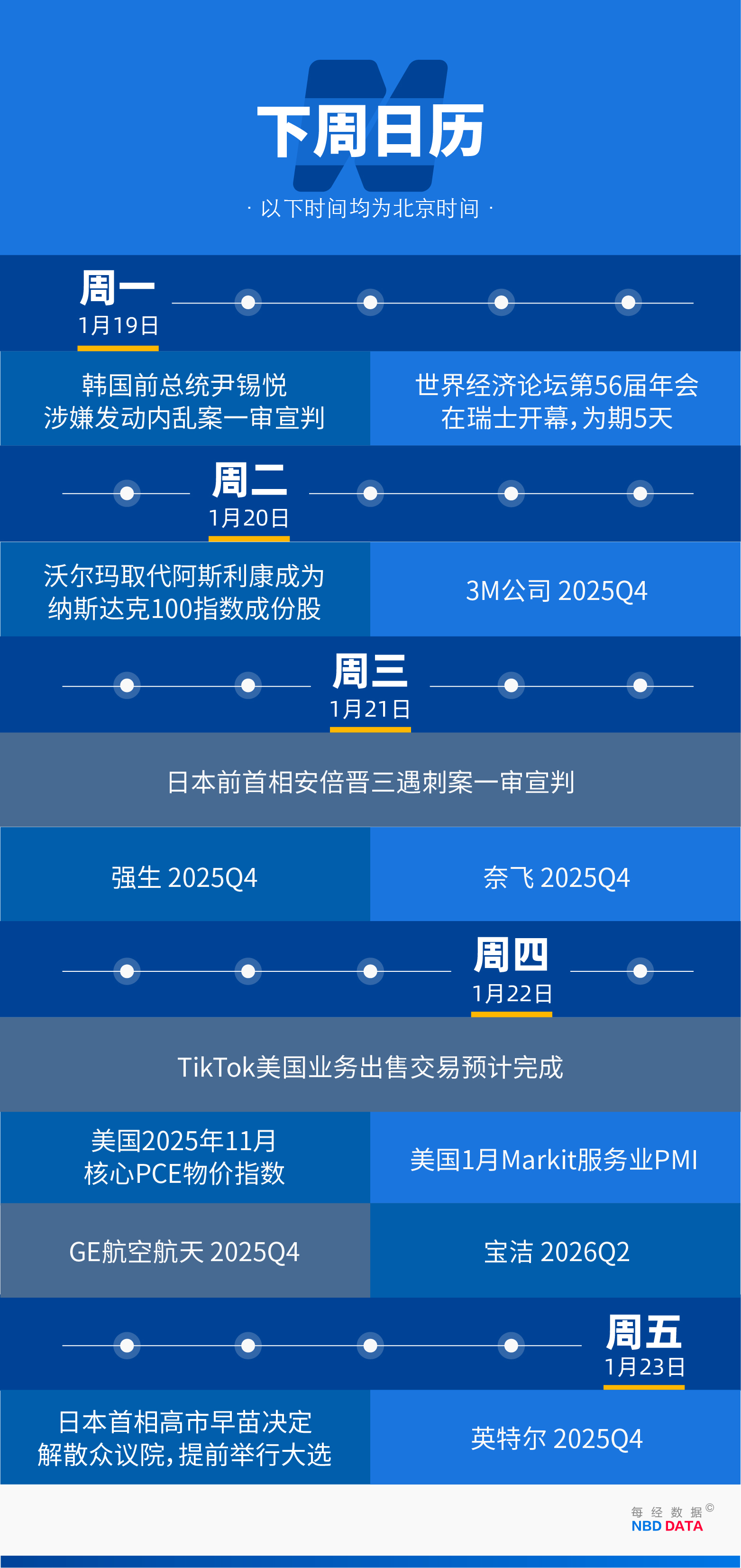 ◆ 最热美联储主席人选生变,“鸽派”哈塞特恐提前出局?特朗普称或对反对美夺格陵兰岛国家征税,欧洲七国已向格陵兰派兵37人;特朗普暂缓对伊朗采取军事行动;遭刑事调查,鲍威尔强硬回应;美国最大半导体设施动工,美光科技周涨超5%创新高;白银周涨超12%,金银比14年来首次跌破50关口。
