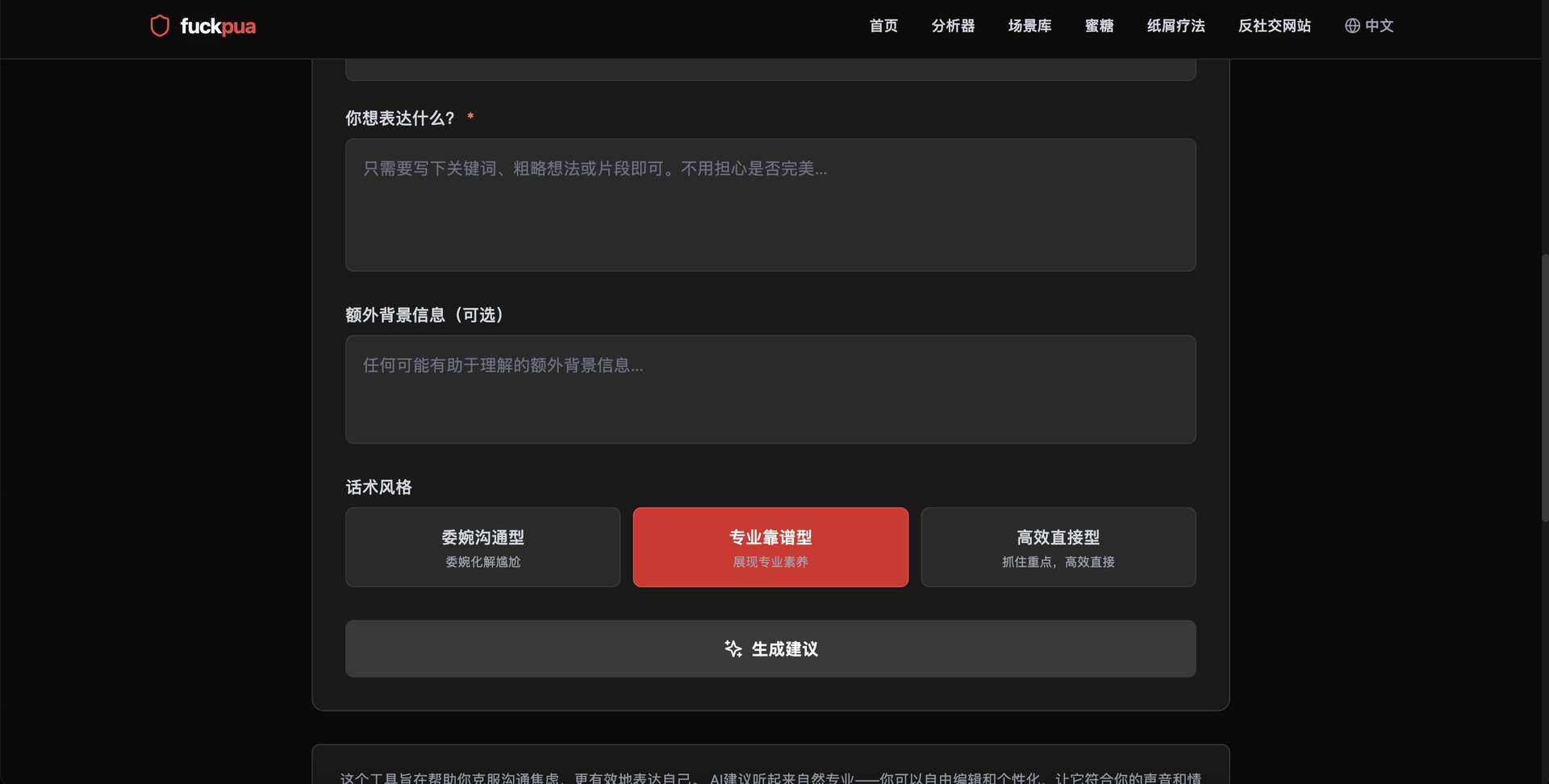 告诉 AI 对话者是谁、你们的关系、你的感受,以及想表达的核心内容。AI 根据这些信息生成表达建议。选择风格:委婉沟通型化解尴尬,专业靠谱型展现专业素养,高效直接型抓住重点。生成的建议基于你的真实情况,可以直接使用,也可以修改让它更符合你的表达习惯。最终的表达属于你,只是有了一个清晰的起点,不再需要从空白开始。