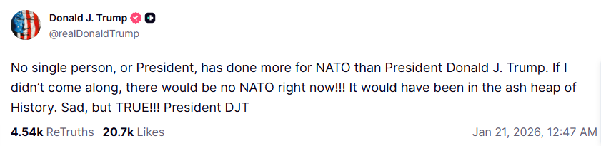 新华社早前报道,特朗普20日在社交媒体上表示,他与北约秘书长吕特就格陵兰岛问题进行了电话交谈,他同意与各方在瑞士达沃斯就该问题举行会议。特朗普称,自己已向所有人明确表明,格陵兰岛“对美国国家和全球安全至关重要,此事没有回头路”。