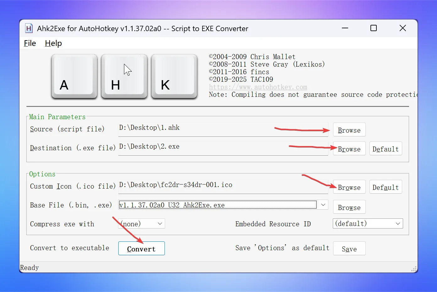 - 选择要转换的.ahk 脚本文件(例如:D:\Desktop\1.ahk)