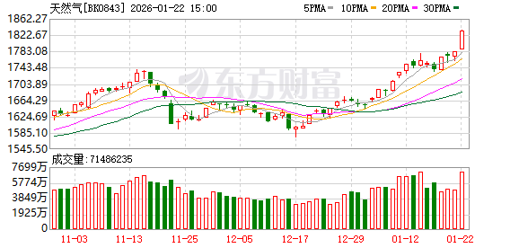 1月22日,天然气板块高开高走,截至早间收盘,板块上涨2.29%,涨幅居两市前列。个股方面,特瑞斯涨超23%,中泰股份涨近16%,洲际油气、蓝焰控股、胜利股份涨停,潜能恒信涨近9%,石化油服、富瑞特装、和邦生物、凯添燃气、雪人集团等涨超7%。