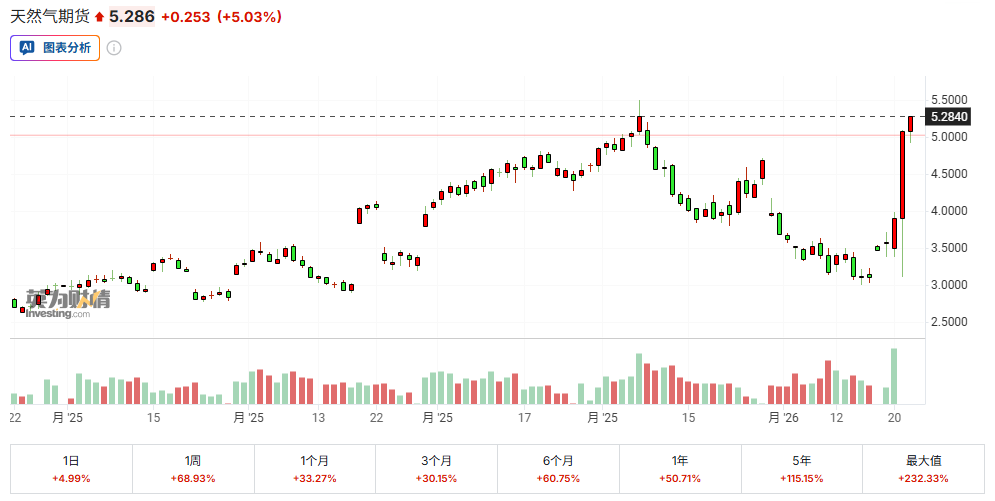 北极冷空气蔓延至北半球大部分地区,市场对取暖需求的预期持续升温。美国天然气期货价格周三一度上涨超29%,两个交易日暴涨了59%。周四,美国天然气期货价格继续走高,截至发稿已涨超5%。据机构统计,近35年的历史数据显示,美国天然气期货正迎来有记录以来最大的单周涨幅。