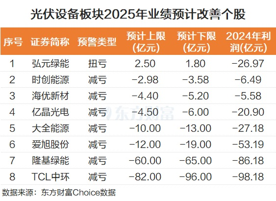 从目前已披露的2025年业绩预告来看,不少光伏设备概念的业绩呈明显改善之势。比如弘元绿能,2024年亏损26.97亿元,2025年预计盈利1.8亿元-2.5亿元。亿晶光电、大全能源、隆基绿能、TCL中环预计业绩减亏。