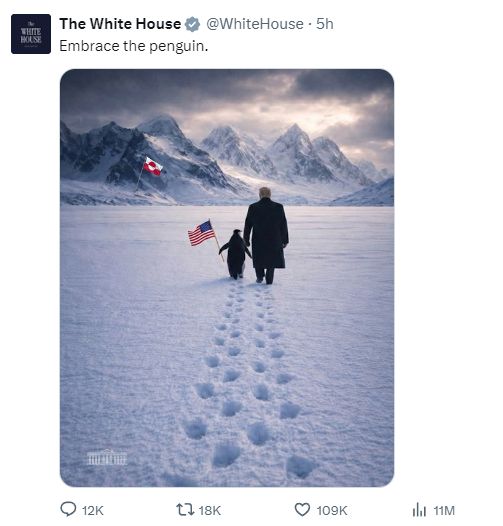 据央视新闻,当地时间1月23日,美国白宫在社交媒体发布了一张AI图片。图片中美国总统特朗普和手持美国国旗的企鹅行走在冰天雪地中,他们的前方插着丹麦自治领地格陵兰岛旗,并配文“拥抱企鹅”。