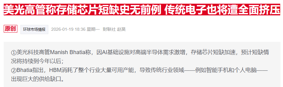 两周前,美光科技全球运营执行副总裁Manish Bhatia也在接受采访时表示,由于AI基础设施对高端半导体需求激增,存储芯片的紧缺状况将持续到今年以后。