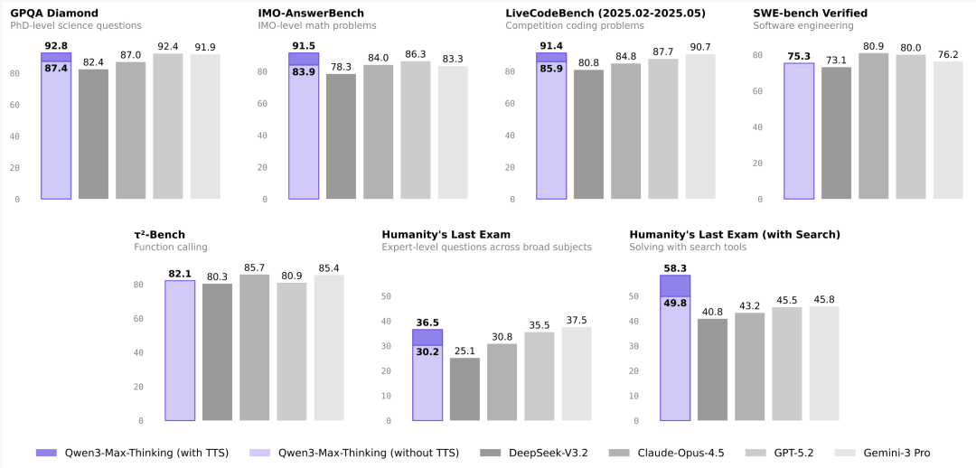 业界普遍的推理时计算,只会简单增加并行推理路径,重复推导已知结论,造成冗余推理效率低下;而千问采用的这一新机制,可对此前推理的结果进行“经验提取”式的提炼,并据此进行多轮自我迭代,在相同的上下文中实现更高效的推理计算,获得更智能的推理结果。基于这一推理技术创新,千问推理性能和推理效率大为提升,比如在启用工具的“人类最后的测试”HLE中,千问得分58.3,大幅超过GPT-5.2-Thinking的45.5、Gemini 3 Pro的45.8,录得当前所有模型的最高分。