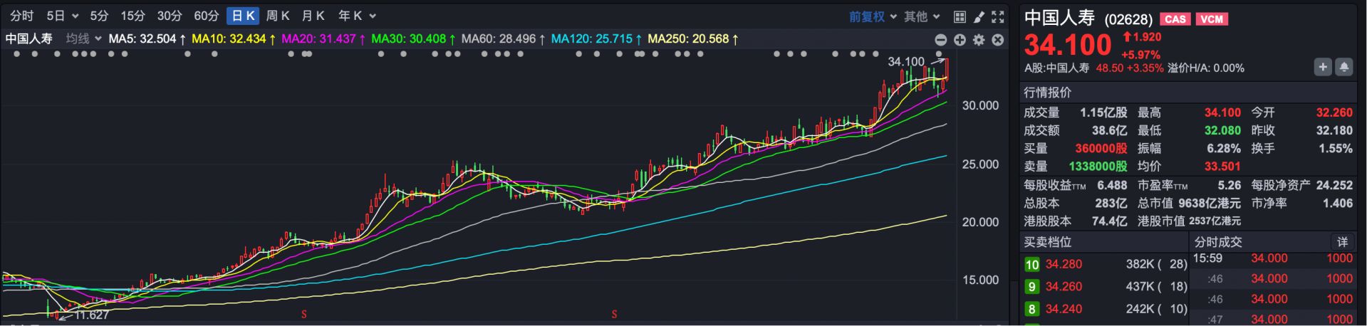 其中,中国人寿(HK02628)涨近6%,创出2015年5月以来新高。此外,友邦保险(HK01299)涨超4%,新华保险、中国人民保险集团涨超3%,中国太平、中国太保、阳光保险、中国平安涨超2%。