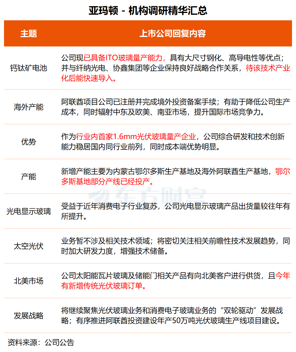亚玛顿昨日接受联储证券、银华基金等近20家机构调研。公司在调研中表示,公司太阳能瓦片玻璃及储能门相关产品有向北美客户进行供货,且今年有新增传统光伏玻璃订单。