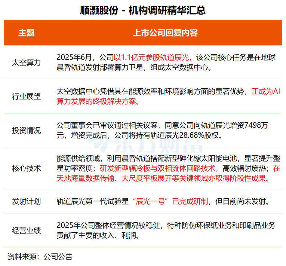 去年6月,顺灏股份以1.1亿元参股主营太空数据中心的轨道辰光,持股比例为19.30%;公司近日审议通过相关议案,拟向轨道辰光进一步增资约7498万元,持股比例将升至28.68%。