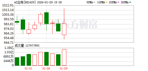 1月29日早盘,AI应用概念股集体走强,Kimi概念、AI语料、AIGC概念、AI智能体、多模态AI等方向涨幅居前。因赛集团、卓易信息、光云科技20cm封板,科大讯飞、人民网、浙文互联等近10股强势涨停,蓝色光标、壹网壹创、值得买、易点天下等多股涨超10%。