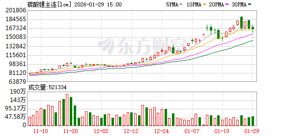 近期,碳酸锂期货价格冲高回落。1月28日,碳酸锂期货主力合约收报166280元/吨,下跌3.9%。