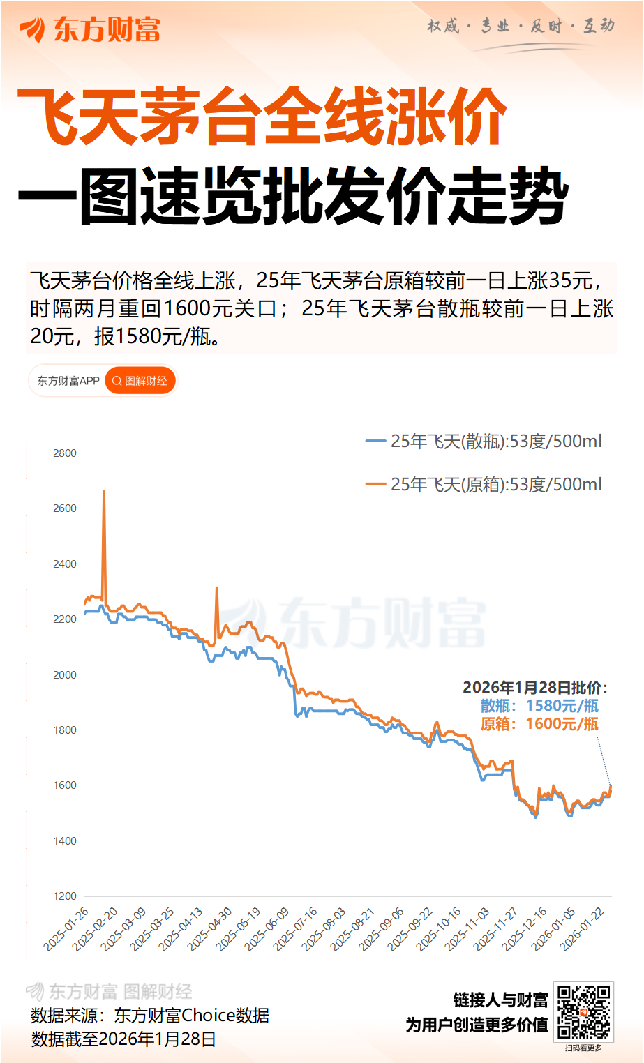 飞天茅台价格持续上涨,25年飞天原箱批价重回1600元关口。