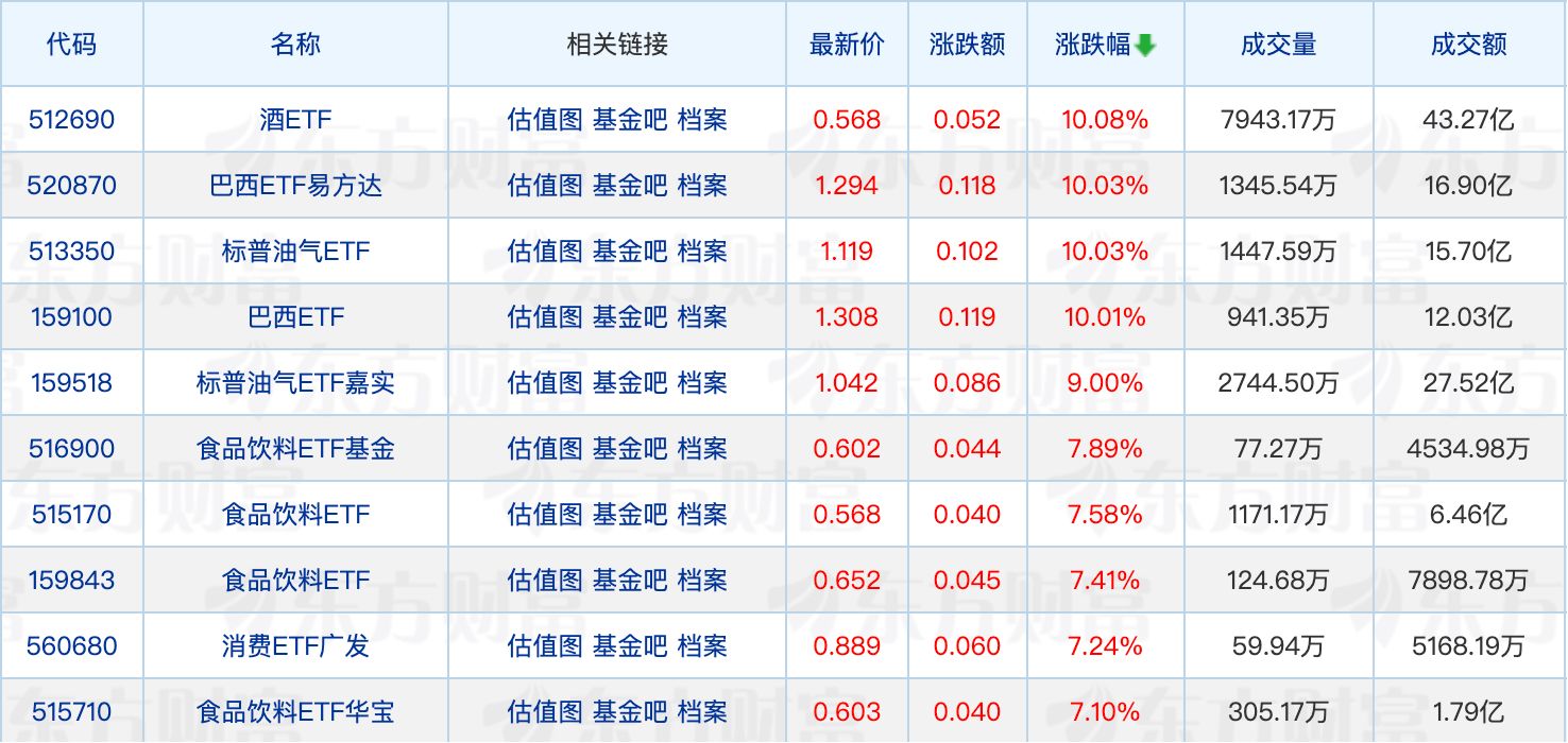 具体来看,白酒板块午后爆发,泸州老窖、水井坊、舍得酒业、皇台酒业、酒鬼酒涨停,酒ETF涨停,食品饮料相关ETF走强。此外,两只巴西ETF、标普油气ETF涨停。