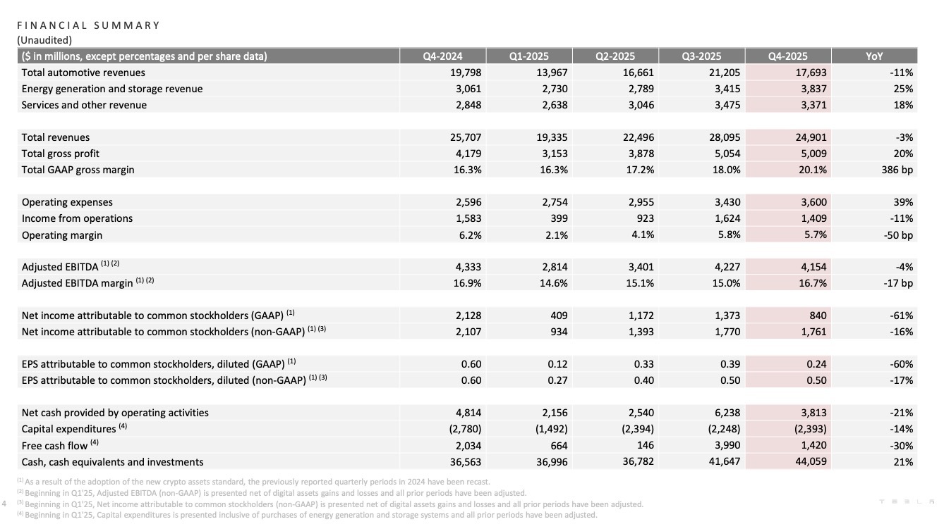 2025年四季度,特斯拉GAAP(公认会计准则)净利润为8.4亿美元,同比下降约61%;非GAAP净利润为17.61亿美元,同比下降约16%;稀释后GAAP每股收益(EPS)为0.24美元,同比下降60%。