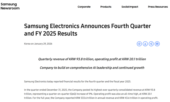 周四(1月29日),全球最大内存芯片制造商三星电子发布了2025年第四季度(截至12月31日)以及2025年全年业绩。