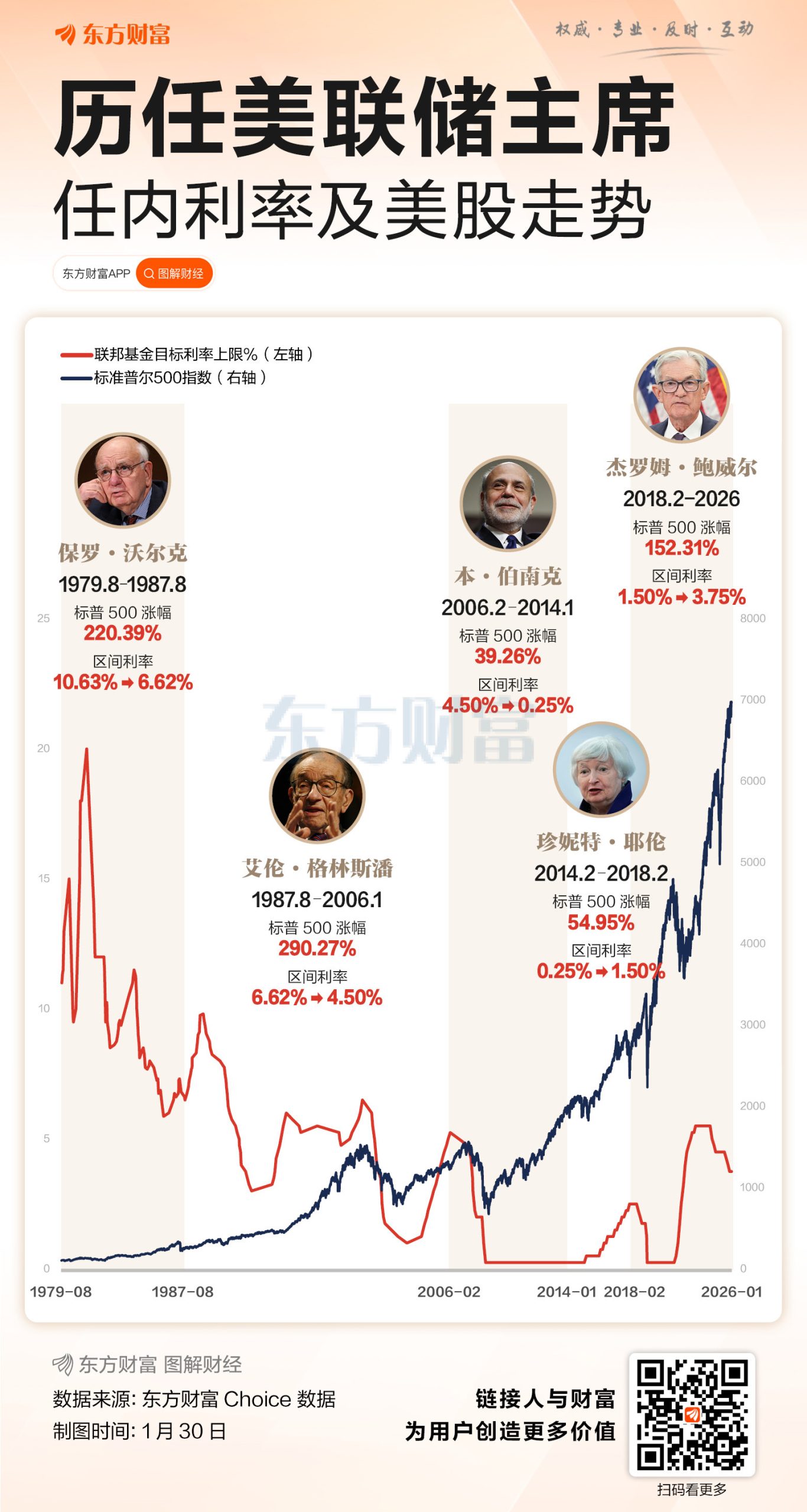 利率方面,沃尔克时期为遏制通胀而激进加息,联邦基金目标利率上限(下称利率)最高升到20%;格林斯潘任期长达18年,期间经历多次加息降息周期;伯南克任期内,利率一路下行,从4.50%降到0.25%;而在耶伦任期内,利率又从0.25%加到1.50%;最后在鲍威尔任期内,利率整体从1.5%上升到3.75%。