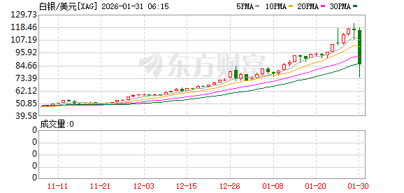 具体行情显示,现货白银价格自北京时间23:00开始加速下滑,凌晨02:40左右跌至盘中低位每盎司74.31美元,跌幅最大时超过36%。截至发稿,银价报85.8美元,跌幅收窄至26%附近。