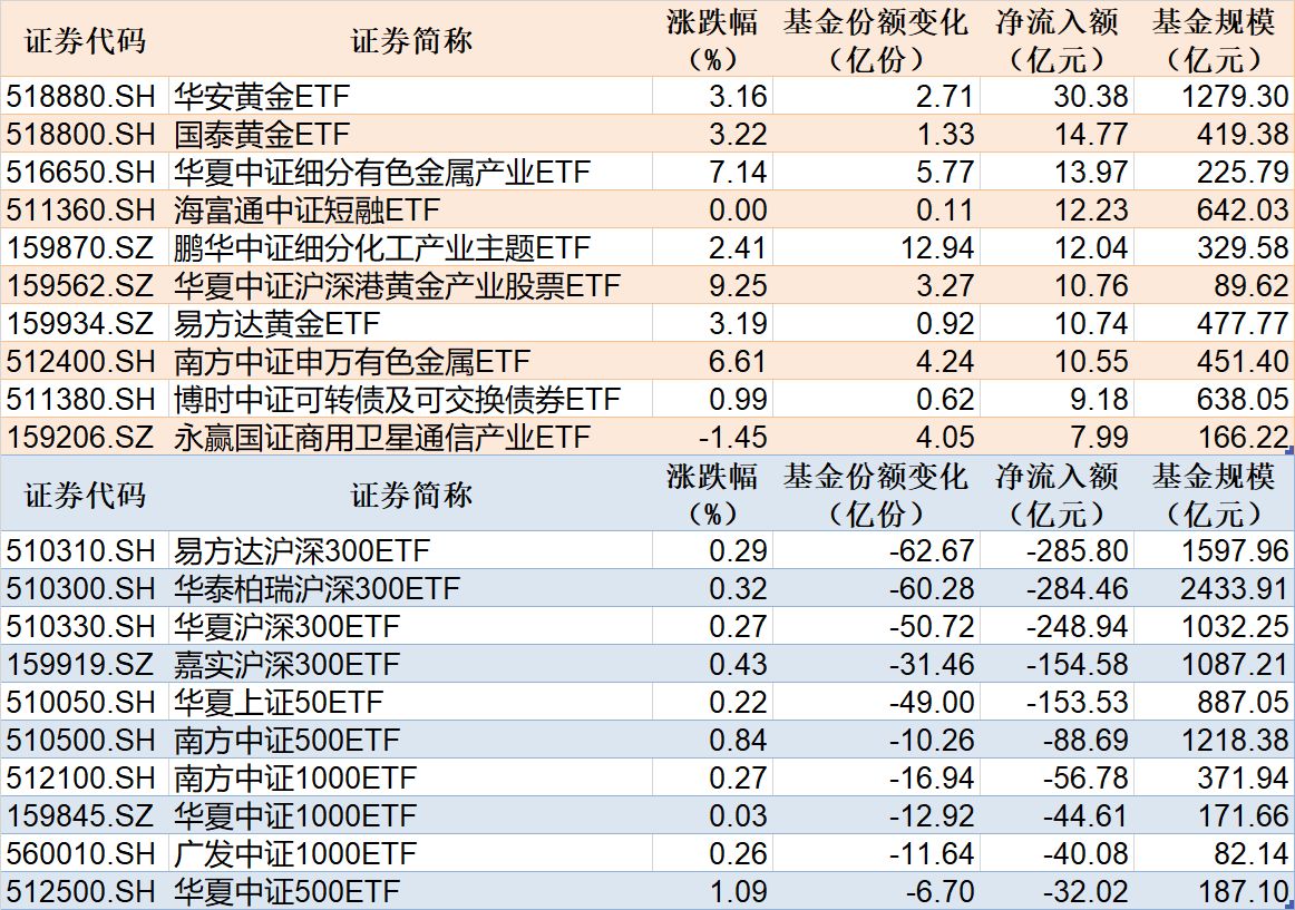 Wind数据显示,在1月28日的非货币ETF市场中,华安黄金ETF基金份额增加2.71亿份,净流入额30.38亿元;国泰黄金ETF基金份额增加1.33亿份,净流入额14.77亿元;华夏中证细分有色金属产业ETF基金份额增加5.77亿份,净流入额13.97亿元。