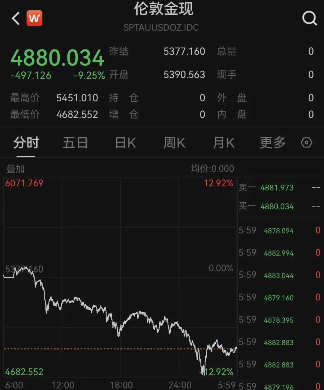 COMEX黄金期货跌8.35%报4907.50美元/盎司,本周累计下跌1.45%。现货黄金收跌9.25%,报4880.034美元/盎司,盘中一度跌近13%,跌破4700美元/盎司。