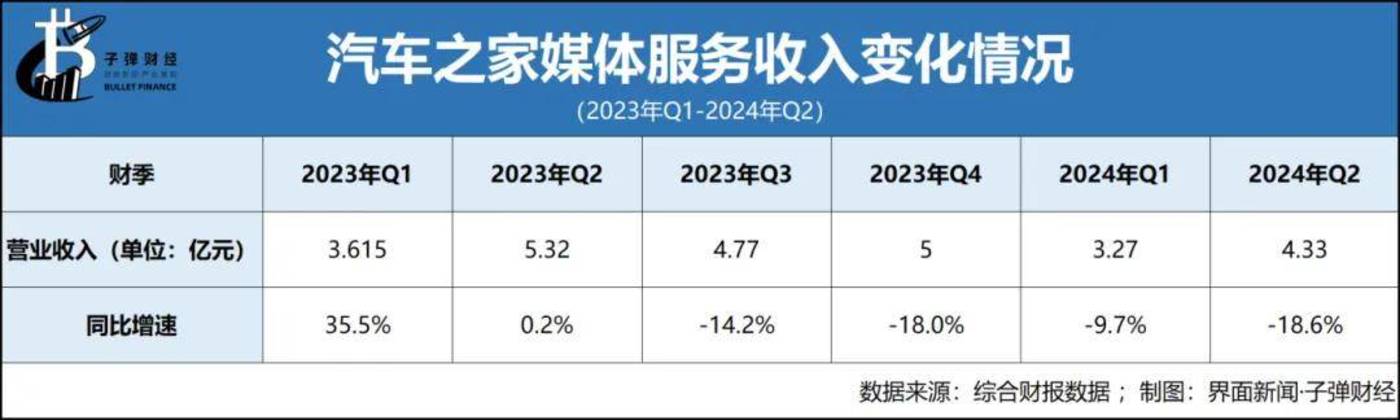 汽车之家财报数据显示,自2023年Q1至今,其媒体服务收入分别为3.615亿元、5.320亿元、4.77亿元、5亿元、3.27亿元及此次的4.33亿元。