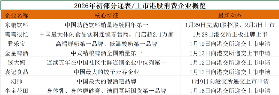 除了上述企业,袁记食品、钱大妈等多家消费企业也在2026开年密集推进赴港上市进程。整体来看,本轮赴港上市的消费企业普遍具备新消费特征,涵盖食品饮料、餐饮、美容护理、生鲜连锁、家居多个消费细分领域,形成了多元化的上市格局。
