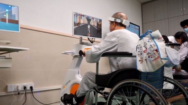 患者通过脑机接口设备开展下肢训练与功能重建,企业供图