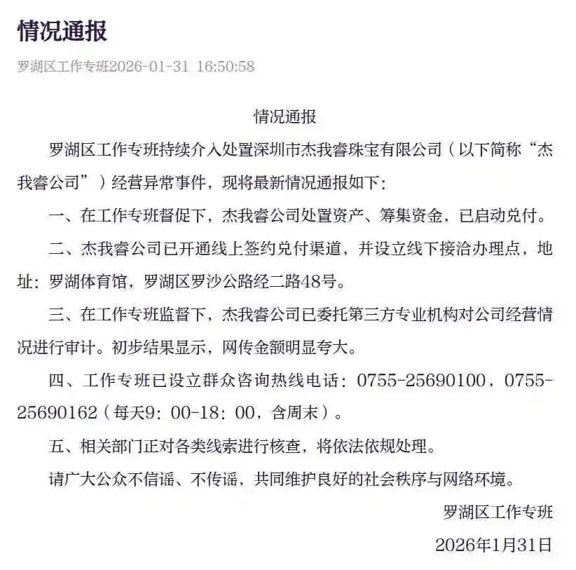 1月31日,罗湖区工作专班发布情况通报显示,在工作专班督促下,杰我睿公司处置资产、筹集资金,已启动兑付。涉及资金方面,通报称:“在工作专班监督下,杰我睿公司已委托第三方专业机构对公司经营情况进行审计。初步结果显示,网传金额明显夸大。”