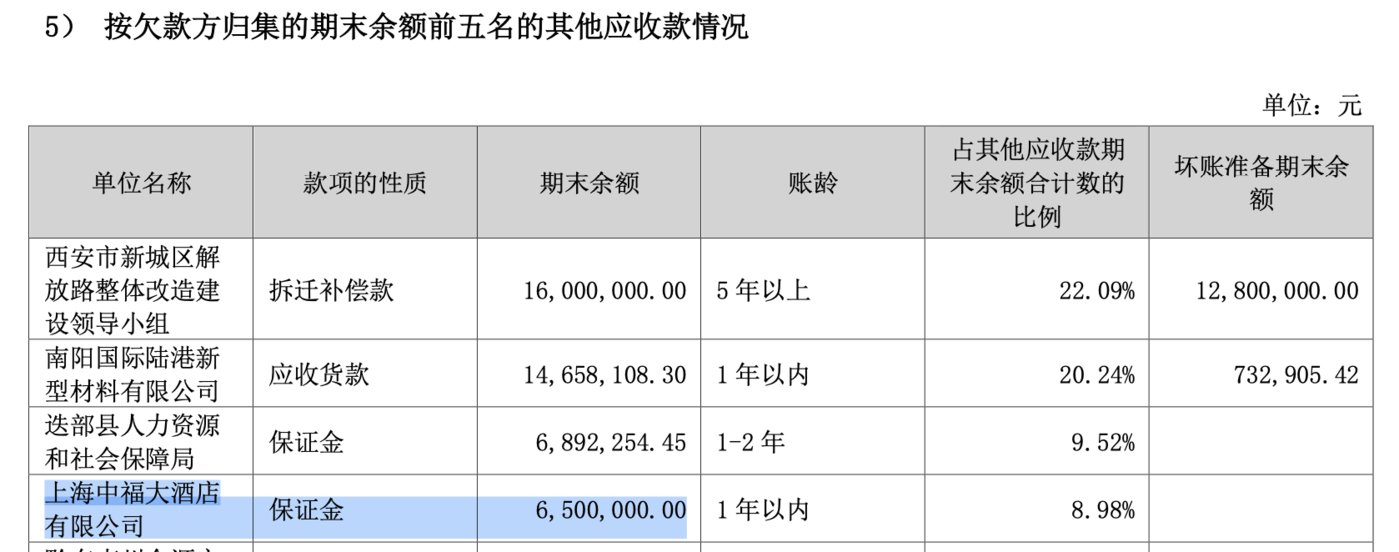 财报显示,2022年上半年,上海中福大酒店有限公司成为西安旅游列第四位的“欠款大户”,所欠650万款项显示为“保证金”。