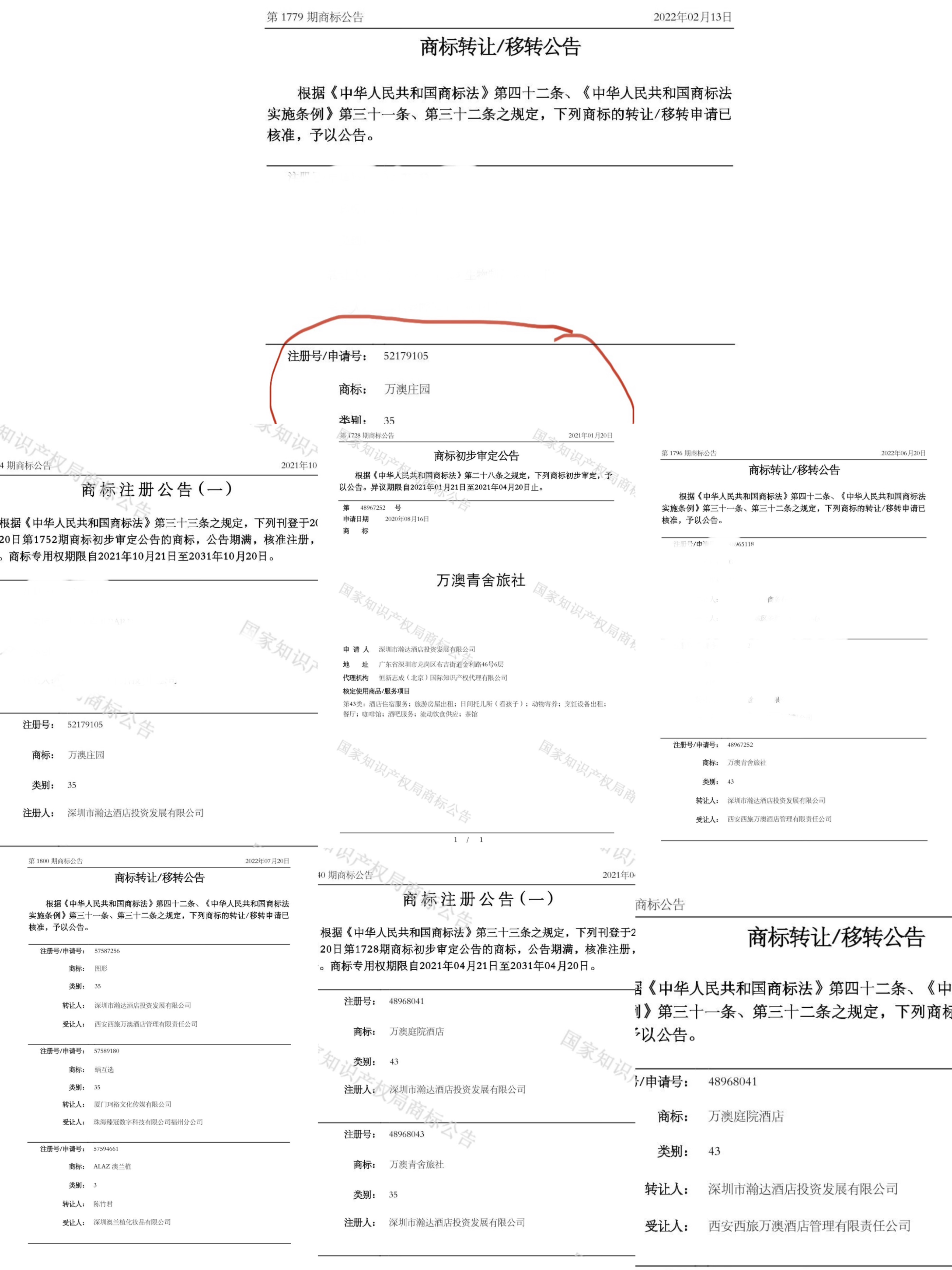 即便在三方已合作设立了西旅万澳公司之后,深圳瀚达还相继注册了“万澳庄园”、“万澳庭园酒店”、“万澳青舍旅社”及相关图形商标,都是在注册完成后再转让给西旅万澳公司,陆续构成西旅“万澳系品牌矩阵”。