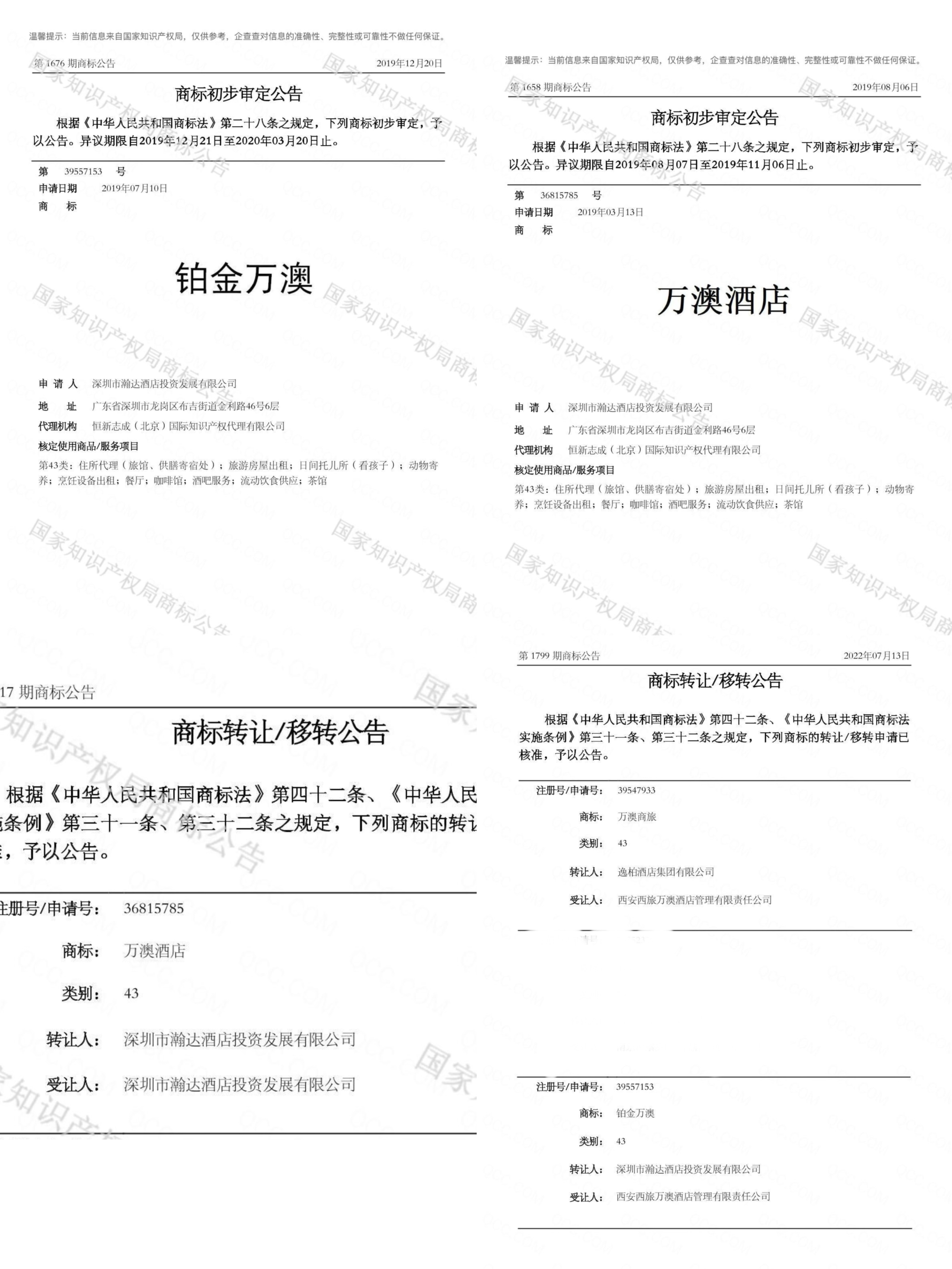 据中国商标网公示信息,2019年3月,深圳市瀚达酒店投资发展有限公司(简称“深圳瀚达”)申请注册“万澳酒店”商标(以下均指43类、35类),2019年7月申请注册“铂金万澳”,这两个商标均在当年获准申请后注册发文。