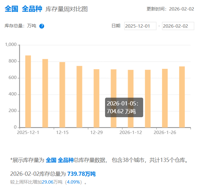 新华财经北京2月2日电钢银电商最新公布的数据显示,截至2月2日的一周,全国38个城市,共计135个仓库的城市钢材总库存量为739.78万吨,较上周增加29.06万吨,增幅4.09%。