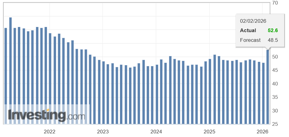 根据供应管理协会(ISM)周一公布的数据,美国1月制造业采购经理人指数(PMI)意外从上个月的47.9升至52.6,近一年来首次进入扩张区间,也是自2022年2月以来的最高值。