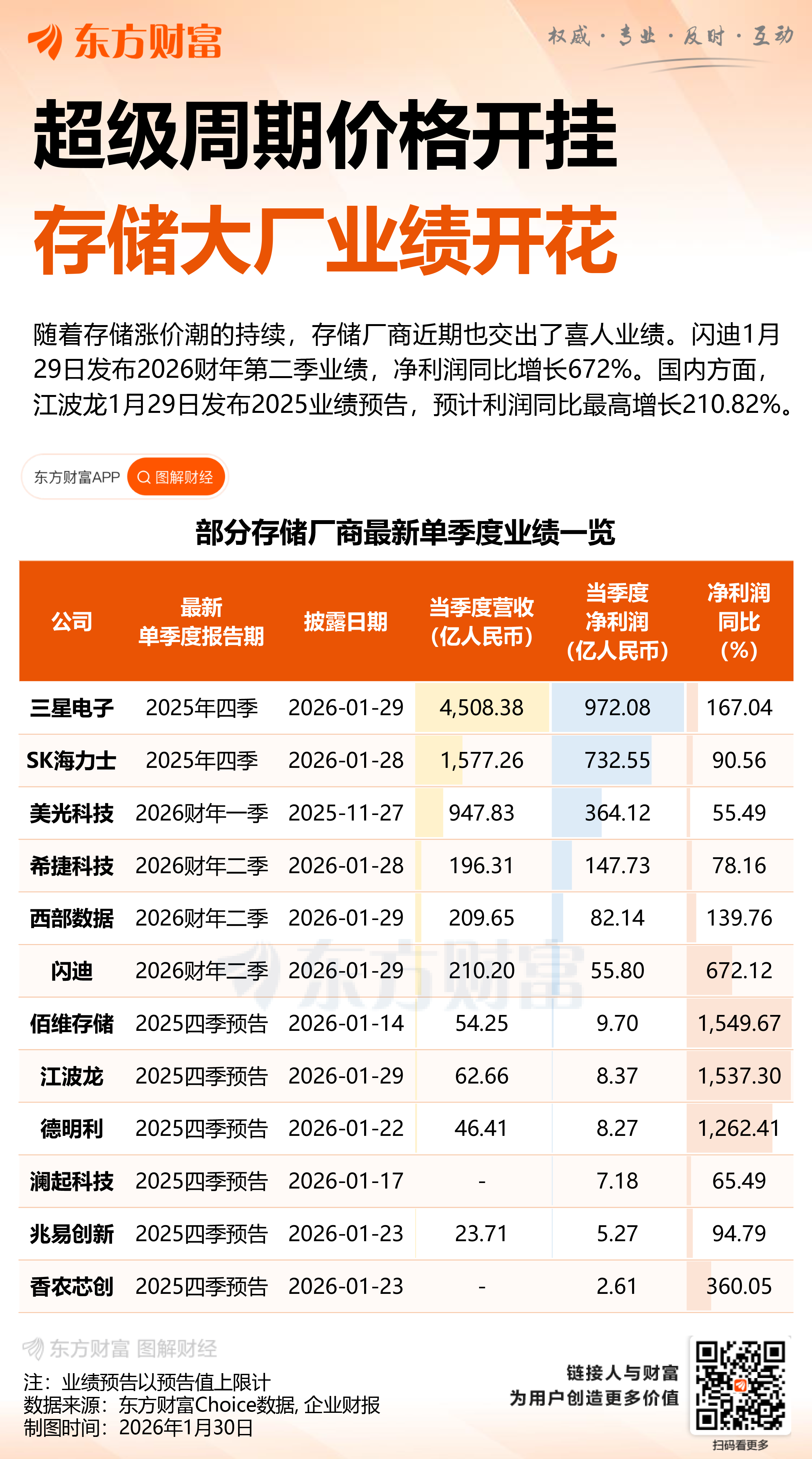 隔夜美股市场,三大指数全线走强,道指大涨超1%,标普500指数逼近历史新高。其中,存储芯片概念股全线爆发,闪迪盘中一度暴涨近17%,西部数据一度大涨超10%。消息面上,高盛暴力上调2026年第一季度DRAM(动态随机存取存储器)价格涨幅预测,预计环比涨幅将高达90%—95%,远超此前市场及该行自身的预期。