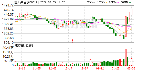 在前一日上涨后,2月3日上午开盘后贵州茅台股价再次上涨,开盘后一度涨超3%,位居白酒板块前列,随后涨幅收窄至2%左右。