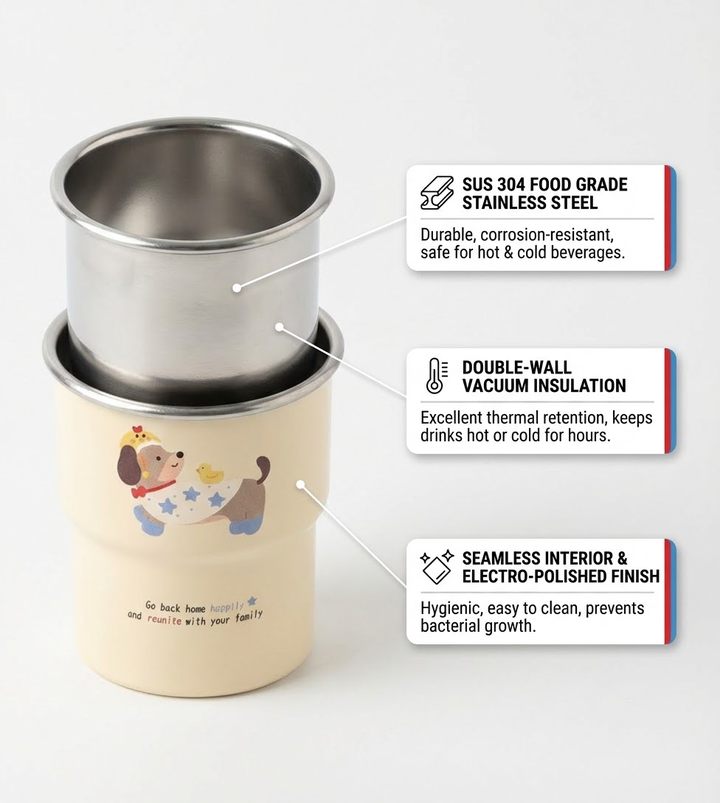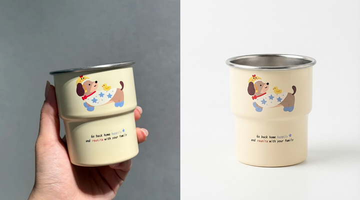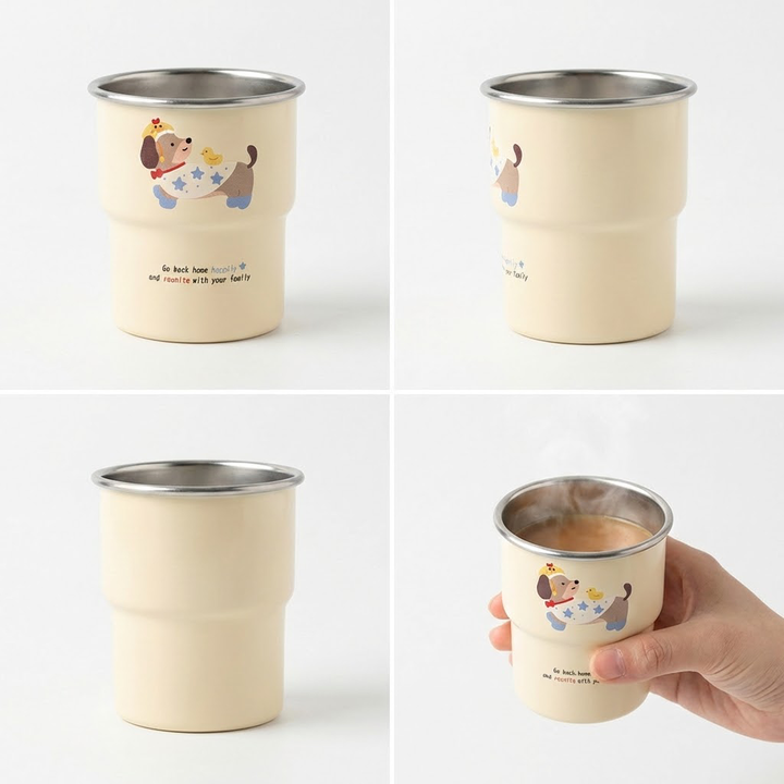 在原图的基础上,保留杯子主体,日系清新风,中景聚焦温馨居家桌面。木质桌面上,米白色针织餐垫摆放杯子,旁有复古胶片相机、白色花瓶(插尤加利叶)、米色信封,背景是米色纱帘。暖色调,木棕、米白、灰绿为主,质感治愈精致,光影柔和明亮;营造日系居家静物摄影氛围。