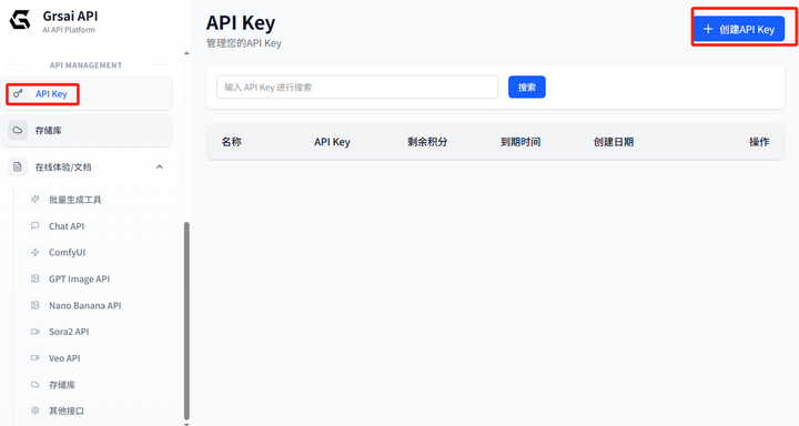 - 访问 Grsai:grsai.com/zh/dashboard/api-keys (com 域名需要魔法才可访问,没有魔法改成.ai 即可)