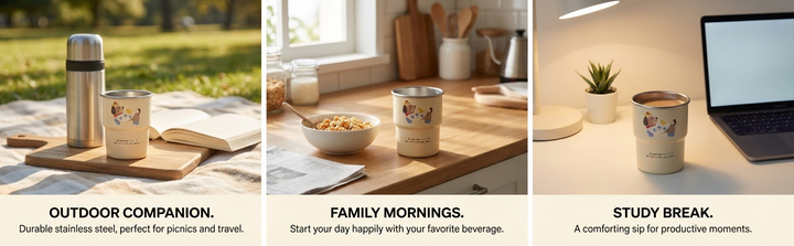 Based on the product in the reference image, generate a lifestyle/usage scenario module image for an Amazon A+ page. Place 3-4 high-resolution, realistic lifestyle photos horizontally side-by-side (uniform size, consistent spacing, borderless or very thin borders). Each photo showcases the product in its natural state in different everyday/outdoor scenarios, with the product fully integrated into the environment and lighting (placed appropriately, seamlessly blending with the background, and with natural and consistent shadows/reflections, avoiding stiff placement or a post-processed look). Below each photo, or lightly overlay a minimalist English selling point title and a short descriptive text (naturally generated based on the product’s actual function and usage context, with functional technical details and a slight connection to the scene, and minimal text overall). The overall color scheme should be warm and natural, with perfectly consistent lighting. The layout should be minimalist, clean, symmetrical, and balanced, with a pure white or light-colored background transition. High-resolution professional e-commerce page design, without overlapping cropping or unnecessary decorations, creating a relaxed, realistic, and immersive atmosphere.