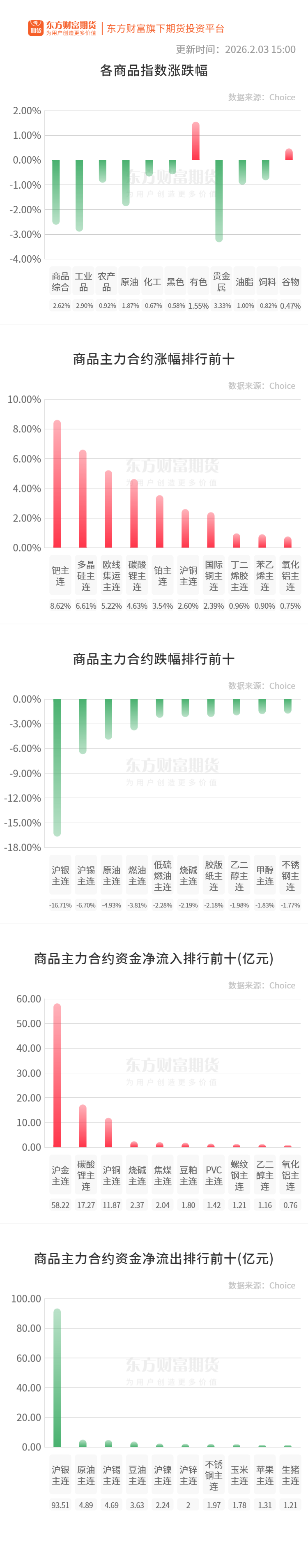 工业硅:2月3日,华东不通氧553#在9100-9300元/吨;通氧553#在9300-9400元/吨;521#在9400-9500元/吨;441#在9400-9600元/吨;421#在9500-9800元/吨;421#有机硅用在9800-10200元/吨;3303#在10200-10500元/吨。黄埔港、天津、西北、昆明、上海、新疆、四川地区硅价持稳。97硅今日价格持稳。(SMM)