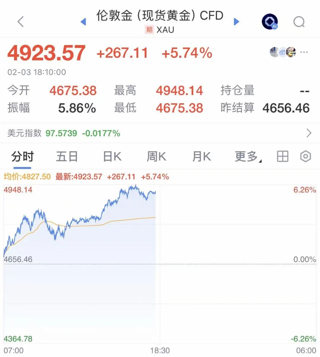 在经历了两天“史诗级”暴跌后,2月3日黄金和白银价格开始强力反弹。截至发稿,现货黄金报4923.57美元/盎司,重新站上4900美元关口,日内涨幅近6%。现货白银报87.15美元,日内涨幅超10%。