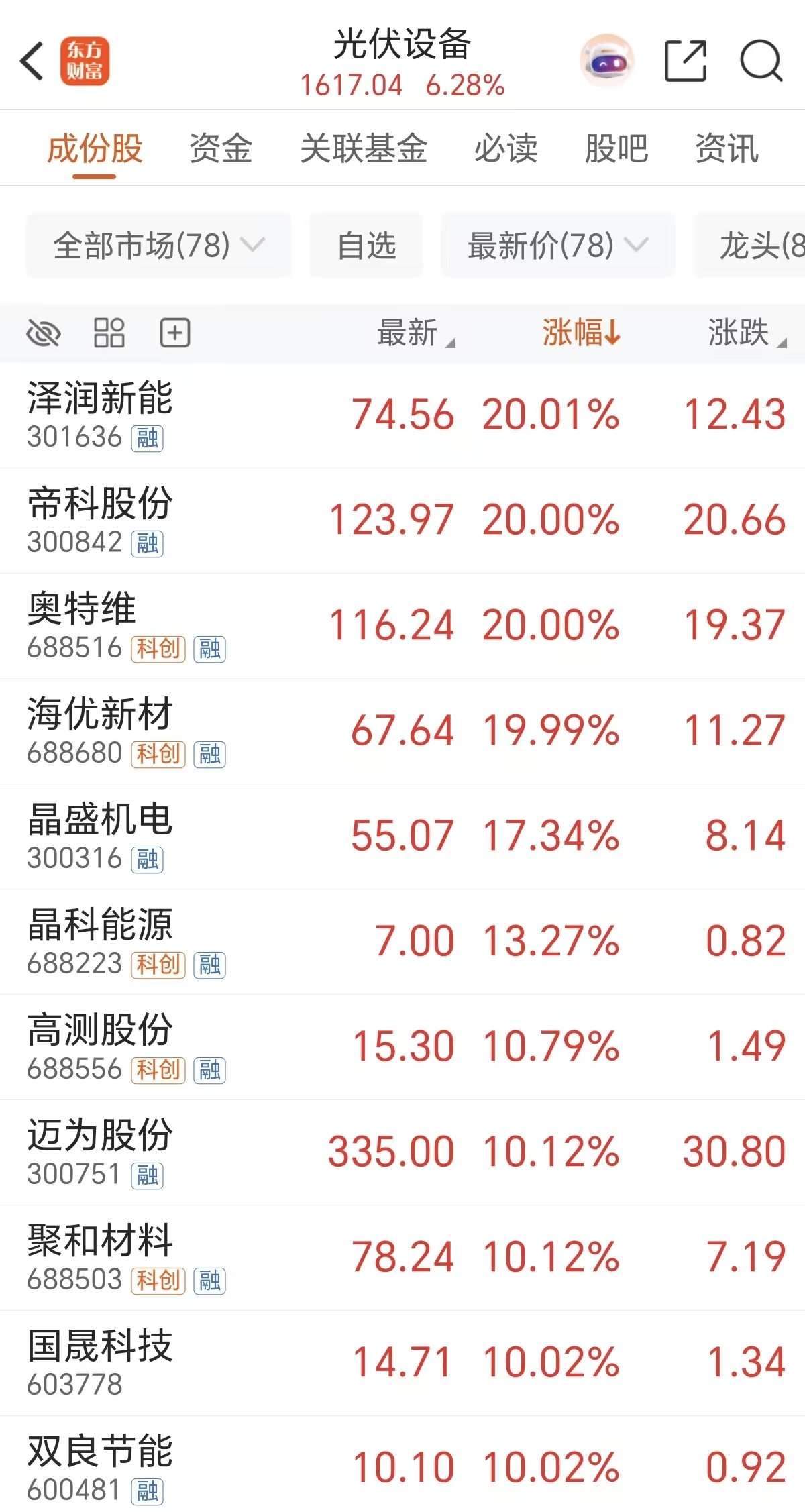 周二(2月3日)光伏设备板块大涨,截至收盘,帝科股份、奥特维等20CM涨停,福斯特、钧达股份等多股涨停。