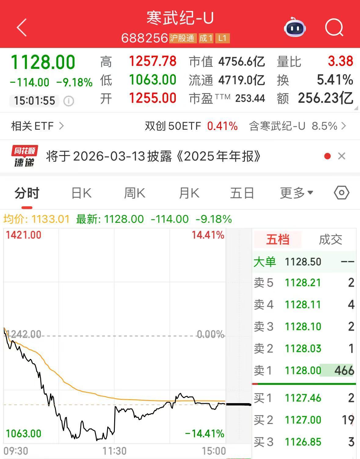 2月3日,寒武纪(SH688256)股价盘中大幅跳水,一度跌超14%。截至A股收盘,寒武纪跌9.18%,股价报1128元/股,总市值回落到4756.6亿元。