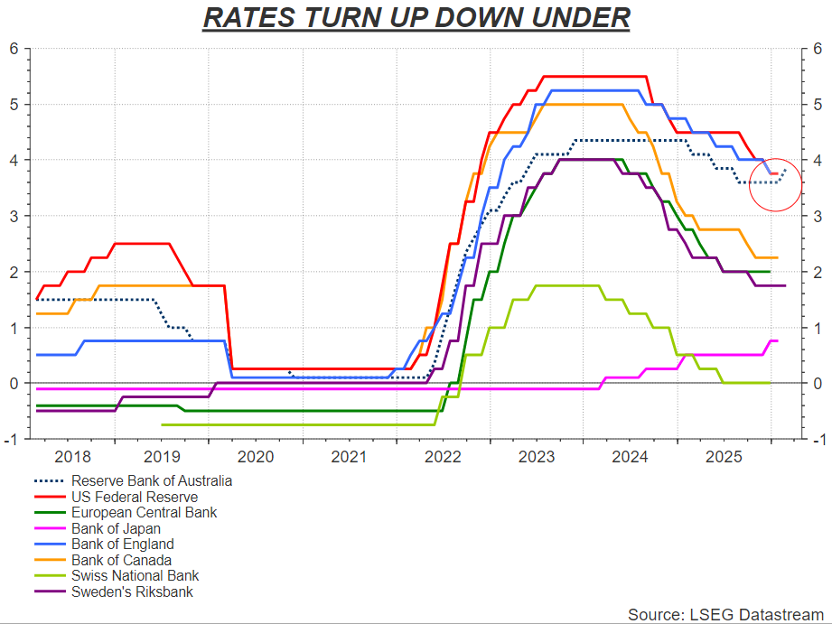除去日本央行的特殊情况外,澳洲联储也是自2023年以来首家加息的主要央行——而就在六个月前,它才刚刚进行了最后一次降息。