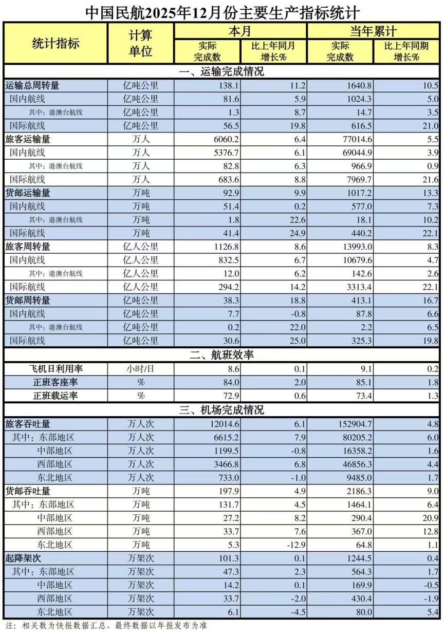 中国民航局数据显示,2025年民航全行业全年共完成运输总周转量1640.8亿吨公里、旅客运输量7.7亿人次、货邮运输量1017.2万吨,同比分别增长10.5%、5.5%、13.3%,旅客运输创历年新高。2025年,民航局服务高水平对外开放,国际航班恢复至2019年90%以上,国际旅客运输量同比增长21.6%。