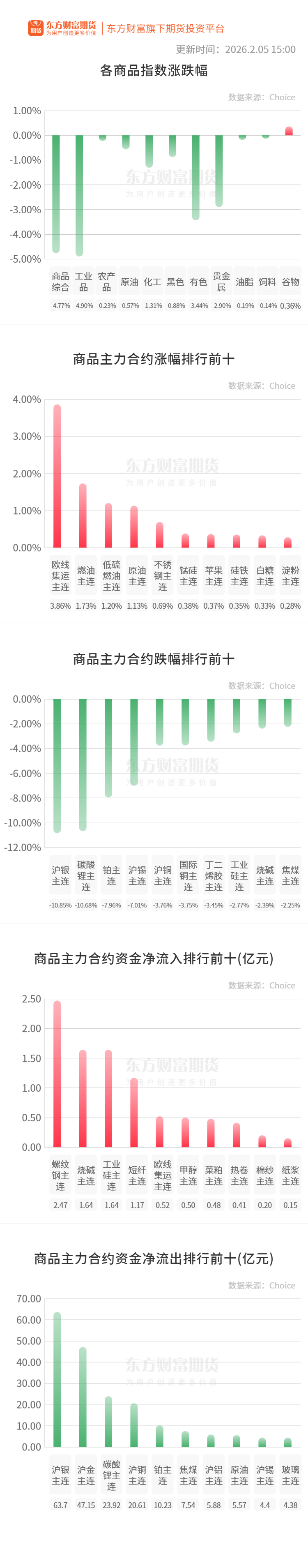 钢材:据Mysteel,截至2月5日当周,螺纹钢产量由增转降,厂库连续三周增加,社库连续第五周增加,表需连续三周下降。螺纹产量191.68万吨,较上周减少8.15万吨,降幅4.08%;螺纹厂库153.65万吨,较上周增加4.52万吨,增幅3.03%;螺纹社库365.92万吨,较上周增加39.52万吨,增幅12.11%;螺纹表需147.64万吨,较上周减少28.76万吨,降幅16.3%。(Mysteel)