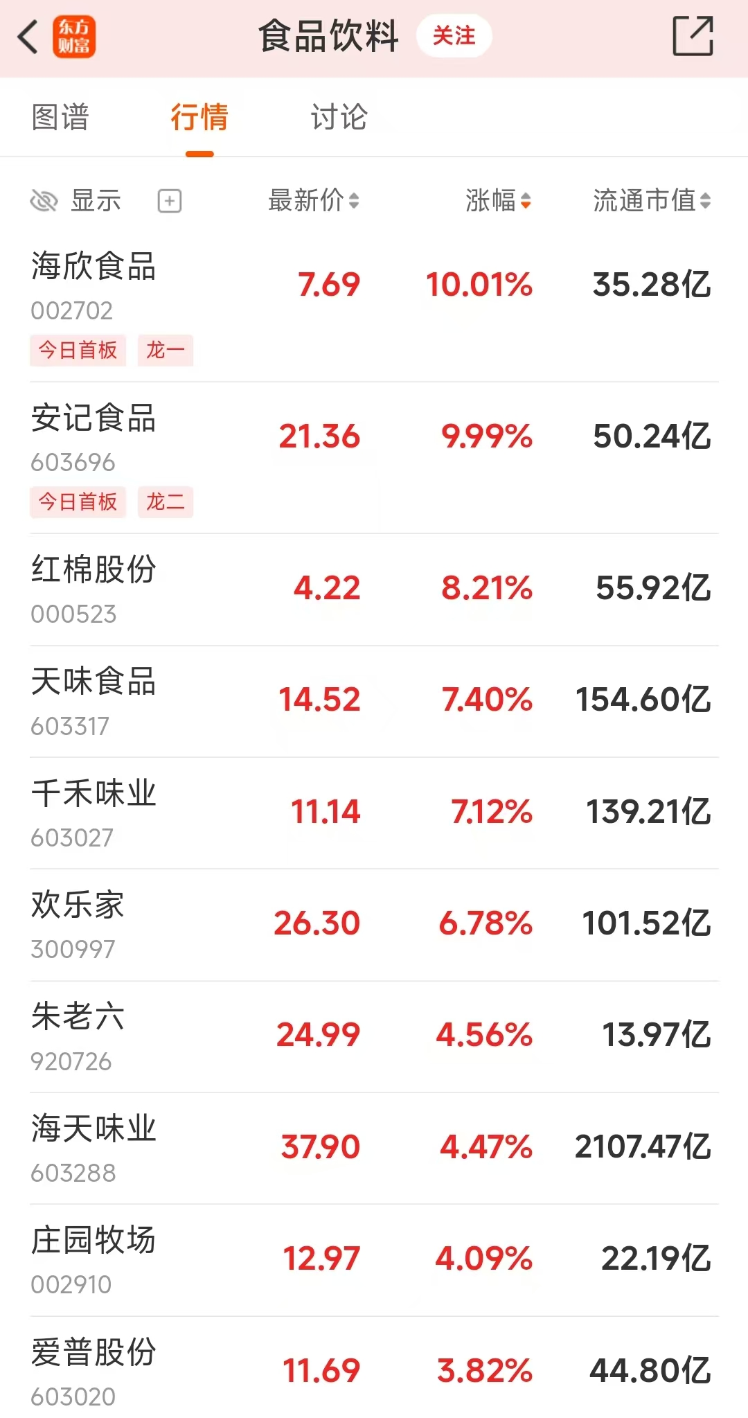 食品饮料板块2月5日早盘表现强势,海欣食品、安记食品涨停;红棉股份、天味食品、千禾味业、欢乐家等也明显上涨。